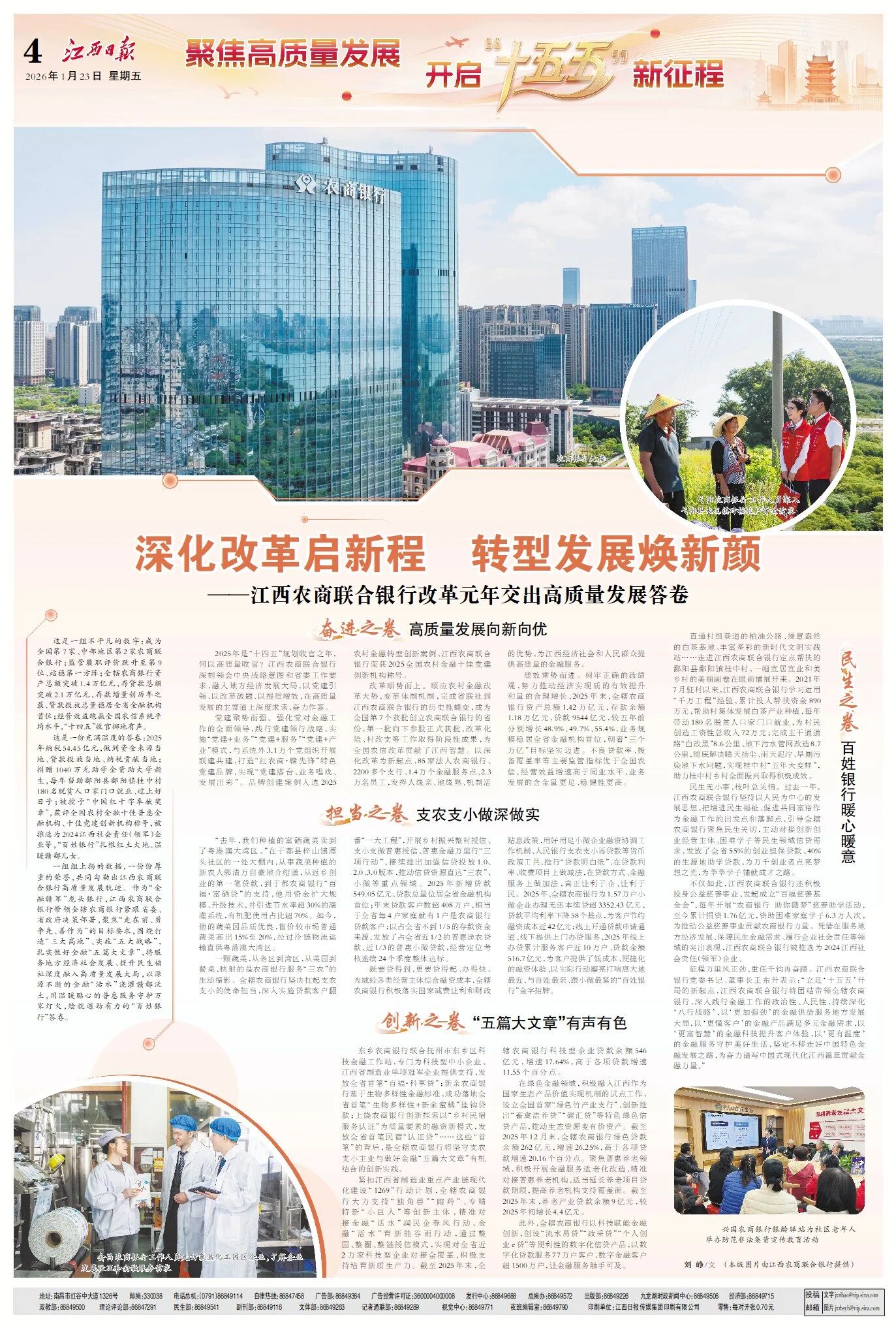 一组组上扬的数据,一份份厚重的荣誉,共同勾勒出江西农商联合银行高质量发展轨迹。作为“金融赣军”龙头银行,江西农商联合银行带领全辖农商银行紧跟省委、省政府决策部署,聚焦“走在前、勇争先、善作为”的目标要求,围绕打造“三大高地”、实施“五大战略”,扎实做好金融“五篇大文章”,将服务地方经济社会发展、提升民生福祉深度融入高质量发展大局,以源源不断的金融“活水”浇灌赣鄱沃土,用温暖贴心的普惠服务守护万家灯火,绘就遒劲有力的“百姓银行”答卷。